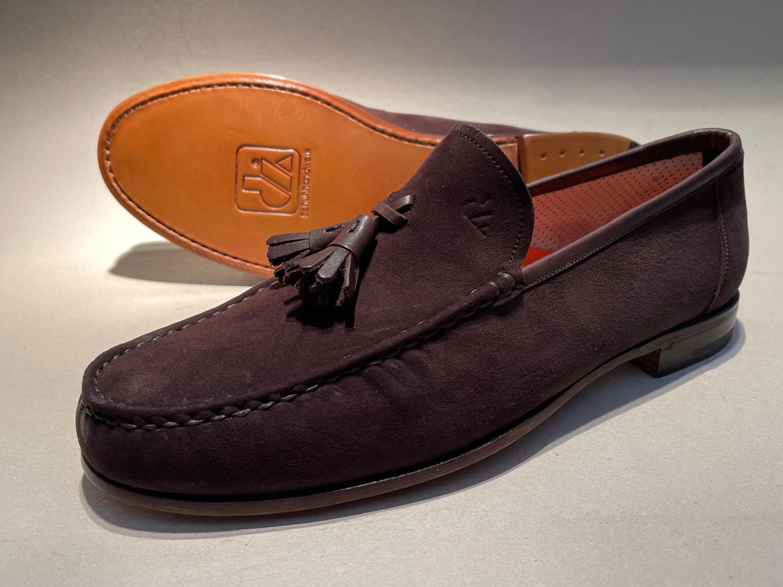 Diese „tassel loafer“ in Mokassin-Machart, sind in weichem Ziegenvelours gefertigt. Die Tassel und die Einstieg-Paspel Ton in Ton aus Nappaleder. Das Paar wird mit 294 Einstichen und zwei Nadeln gearbeitet. Ein weich perforiertes naturbelassenes Futter gewährleistet eine gesunde Fußtemperatur, auch wenn dieser Schuh-Typ im Sommer immer häufiger, barfuß getragen wird. Die Lederlaufsohle und das Oberleder werden rundum 360°durchgenäht. Die Sohle wird am Leisten in Form gefräst.